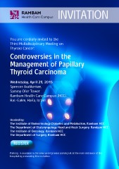 INVITATION You are cordially invited to the Third Multidisciplinary Meeting on Thyroid Cancer: Controversies in the Management of Papillary Thyroid Carcinoma Wednesday, April 29, 2015 Spencer Auditorium, Sammy Ofer Tower Rambam Health Care Campus (HCC) Bat-Galim, Haifa, Israel Hosted by: The Institute of Endocrinology Diabetes and Metabolism, Rambam HCC The Department of Otolaryngology Head and Neck Surgery, Rambam HCC The Institute of Oncology, Rambam HCC The Department of Surgery, Rambam HCC REGISTER Parking is available in the new underground parking lot at the main entrance of the hospital by presenting this invitation.