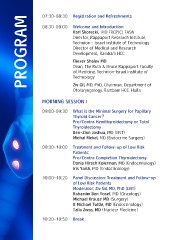 07:30-08:30 Registration and Refreshments PROGRAM 08:30-09:00 Welcome and Introduction Karl Skorecki, MD FRCP(C) FASN Director, Rappaport Research Institute, Technion - Israel Institute of Technology Director of Medical and Research Development, Rambam HCC Eliezer Shalev MD Dean, The Ruth & Bruce Rappaport Faculty of Medicine, Technion-Israel Institute of Technology Ziv Gil, MD, PhD, Chairman, Department of Otolaryngology, Rambam HCC, Haifa MORNING SESSION I 09:00-09:30 What is the Minimal Surgery for Papillary Thyroid Cancer? Pro/Contra Hemithyroidectomy or Total Thyroidectomy Ben-Zion Joshua, MD (ENT) Michal Mekel, MD (Endocrine Surgery) 09:30-10:00 Treatment and Follow-up of Low Risk Patients: Pro/Contra Completion Thyroidectomy Dania Hirsch Kolerman, MD (Endocrinology) Iris Yaish, MD (Endocrinology) 10:00-10:20 Panel Discussion: Treatment and Follow-up of Low Risk Patients Moderator: Ziv Gil, MD, PhD (ENT) Rahamim Ben Yosef, MD (Oncology) Michael Krausz MD (Surgery) R Michael Tuttle, MD (Endocrinology) Tzila Zwas, MD (Nuclear Medicine) 10:20-10:50 Break